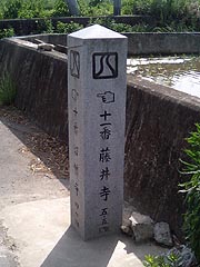 吉野川を渡り、しばらく看板に従って南東に向かい、最後に緩やかな坂を上ると11番藤井寺に到着(16:00)。大きな藤棚が有名だが、花の季節は終わっていた。門前のおばさんに聞いてみたが、今年は虫にやられて、例年に比べて藤の花はとても少なかったそうである。これも暖冬が原因しているのか?藤井寺の境内に、焼山寺への歩き遍路道の入り口がある。さすがにこの時間から登っていく人はいなかった。