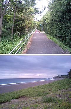 球場を越えてすぐに、「自転車専用道路はこちら」の看板があった。予定にはなかったが、どんな道か試しにそちらを走る。国道の海側を走っている道で、眺めも良く走りやすいので、自転車遍路の方にはお薦めである。夜須町のサイクリングターミナルのあたりまで続く、長い自転車道だった。特に「琴ヶ浜」のあたりは、浜の近くの松原の中を走るので、とても気持ちの良い道だ。歩き遍路の方もこの道を利用していた。但し、車の通る道と違って、小石や木屑などが多いので、ロードバイクではパンクしないように走行に注意する必要がある。