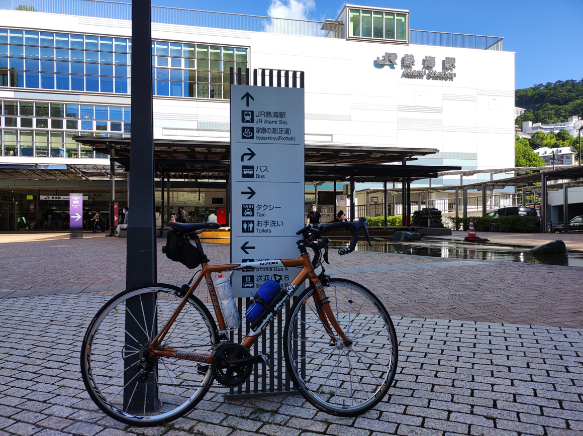まずは、早朝自宅を出発して輪行で熱海駅に。9時前には自転車を組み上げて出発したが、すでに暑い!