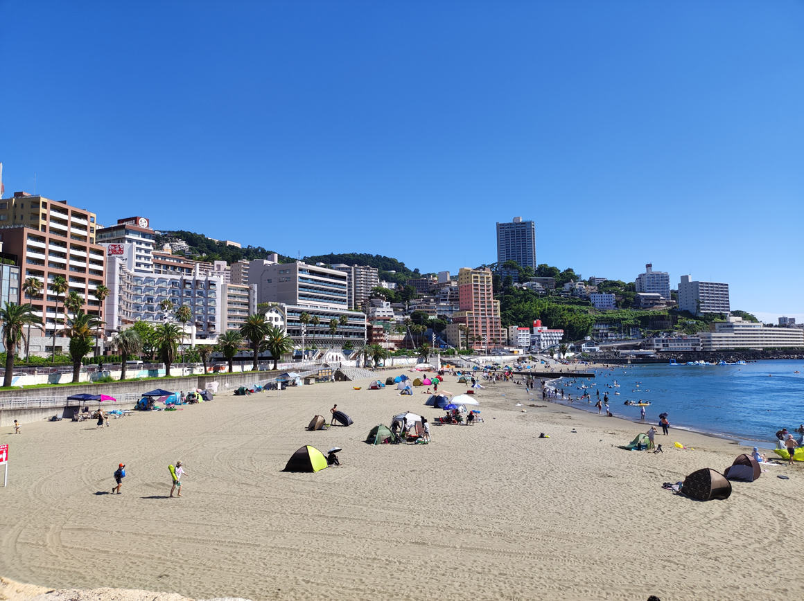 熱海の海水浴場は朝から賑わっていた。気持ちよさそう。海岸沿いの道路からは、沖合に初島が見える。