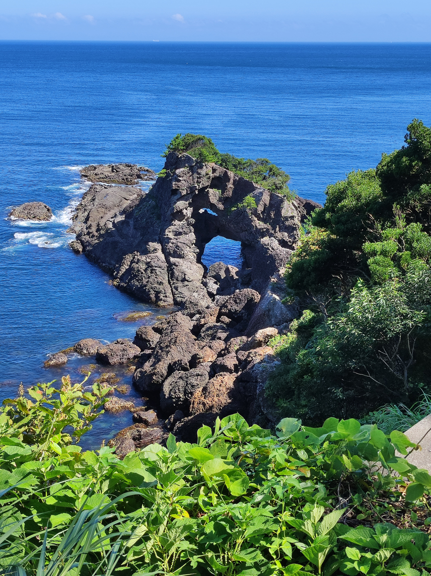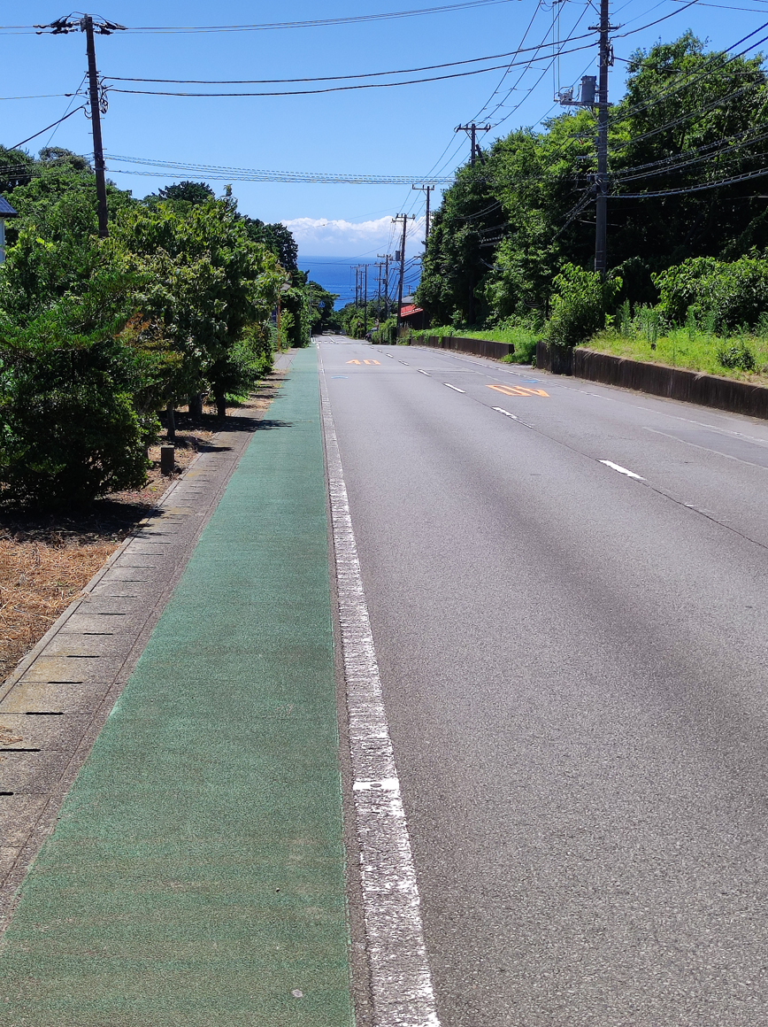 伊東を過ぎたあたりで国道135号を外れて、海岸線に近い県道を川奈方面へ。いくつかアップダウンを越えて城ヶ崎を目指す。昼が近づくにつれて気温も上昇し、水分補給が頻繁になる。国道を外れると自販機が少なくなるため、水分確保のタイミングが重要になる(買える時に買っておくことを学習した)。