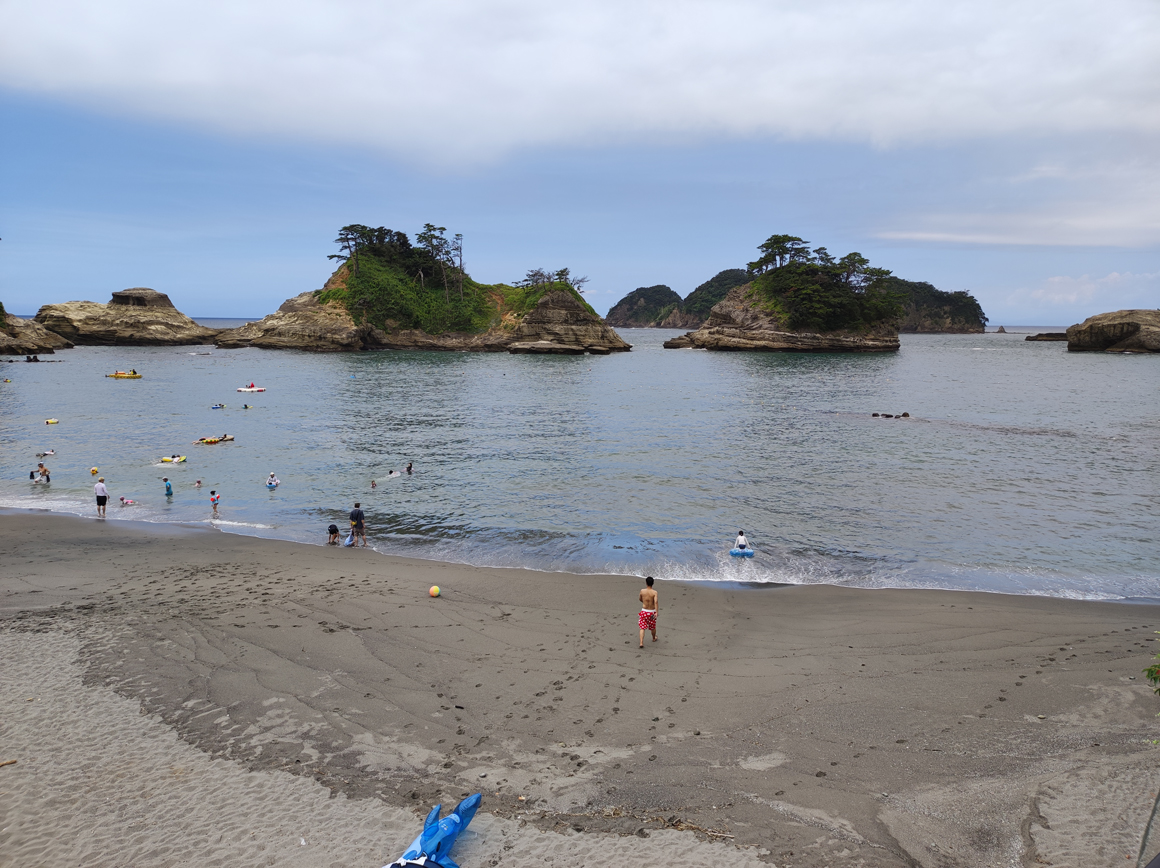 夕方が近づいてくる頃、やっと下田が近づいてきた。下田の白浜海岸は多くの海水浴客で賑わっていた。砂が白く、その影響か水の色もブルーで綺麗な砂浜が続く。紀伊白浜の砂は海外から運んできていると聞いたことがあるが、ここの白砂は地元産?