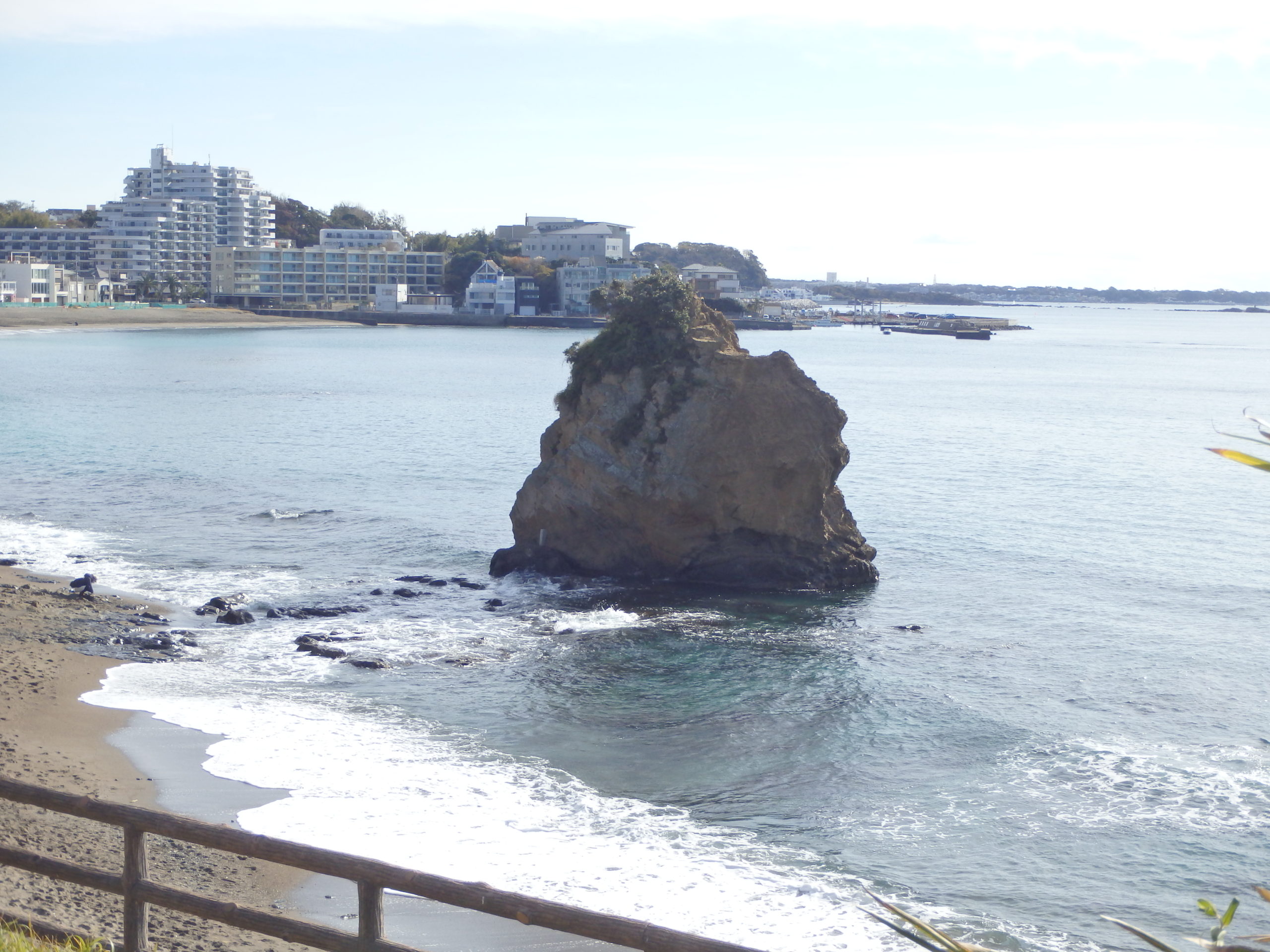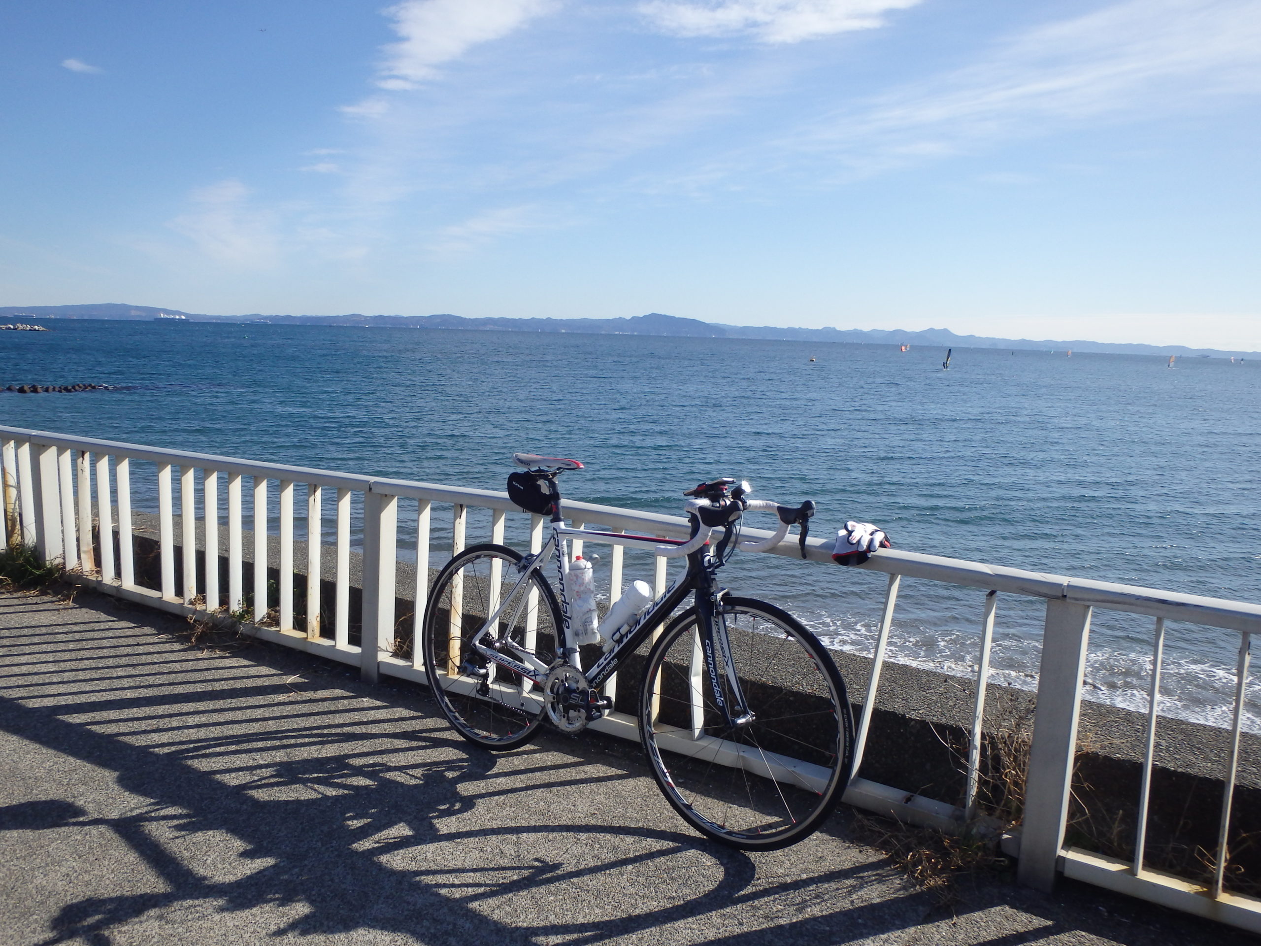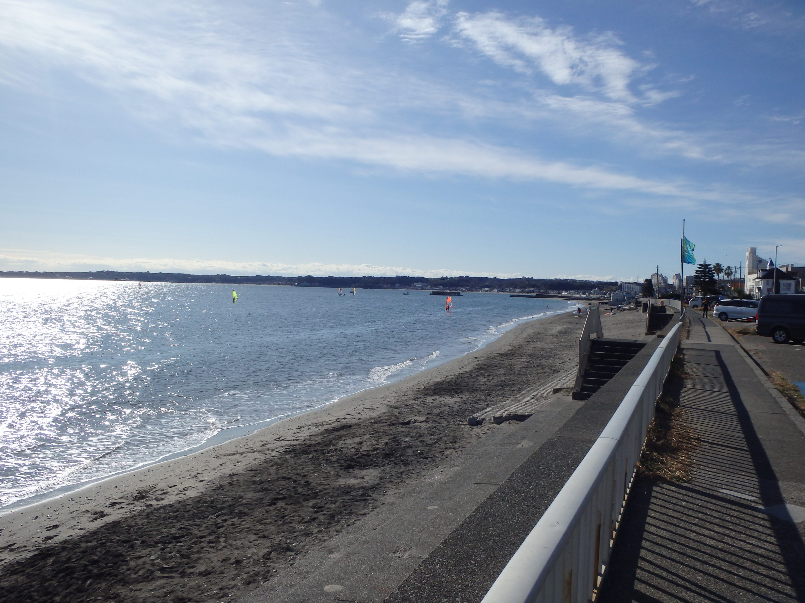 横須賀を過ぎて16号から134号線を経て、三浦海岸に到着。冬晴れで風も弱く穏やかな海岸を眺めながらしばし休憩。ここはウィンドサーフィンのワールドカップが開催される場所だが、今日は風も弱くプレーニングしている艇は見られなかった。
